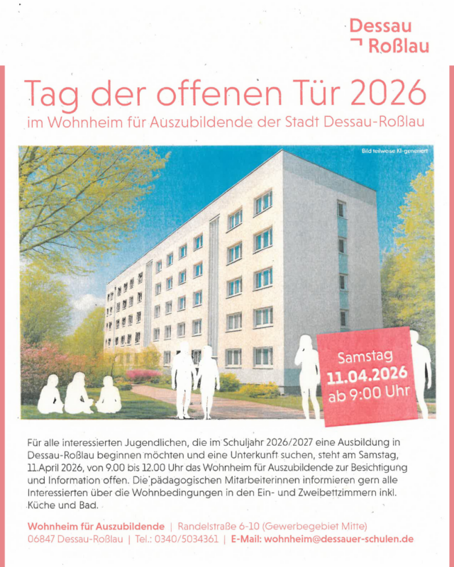 Für alle interessierten Jugendlichen, die im Schuljahr 2026/2027 eine Ausbildung in Dessau-Roßlau beginnen möchten und eine Unterkunft suchen, steht am Samstag, dem 11. April 2026, von 9.00 bis 12.00 Uhr das Wohnheim für Auszubildende zur Besichtigung und Information offen. Die pädagogischen Mitarbeiterinnen informieren gern alle Interessierten über die Wohnbedingungen in den Ein- und Zweibettzimmern inkl. Küche und Bad..
